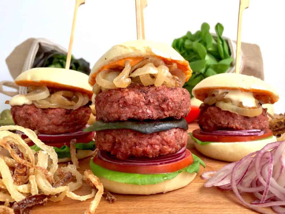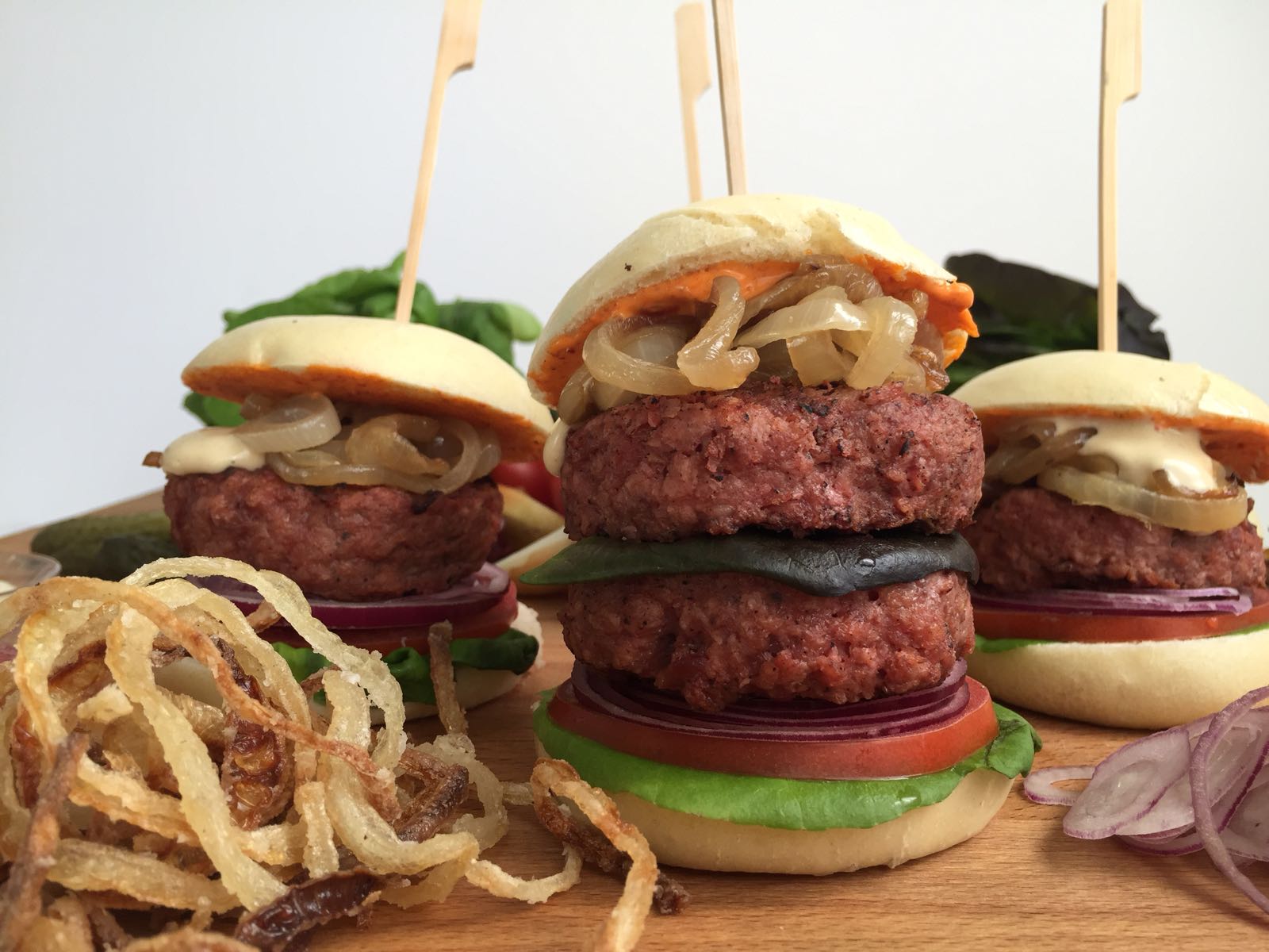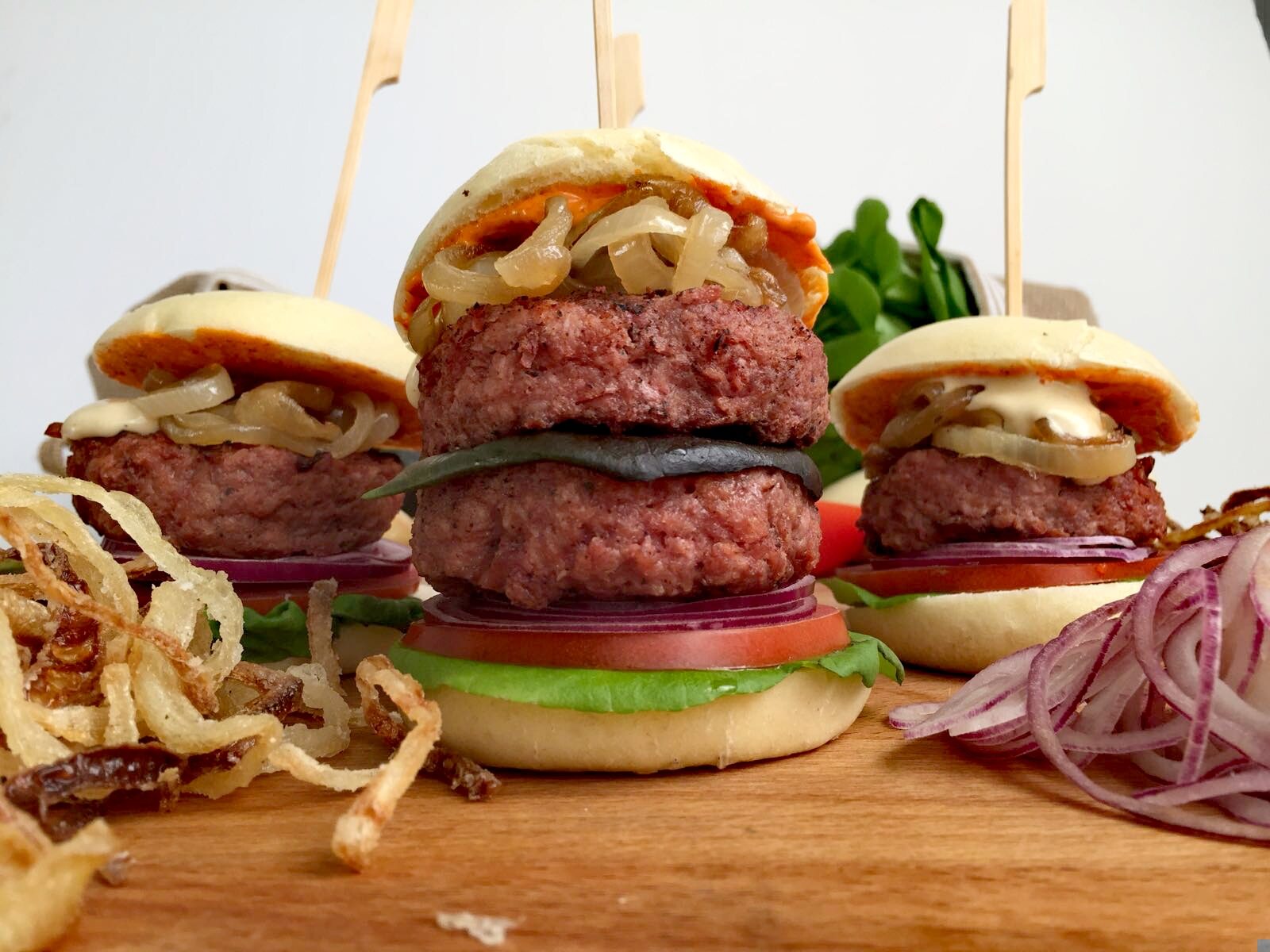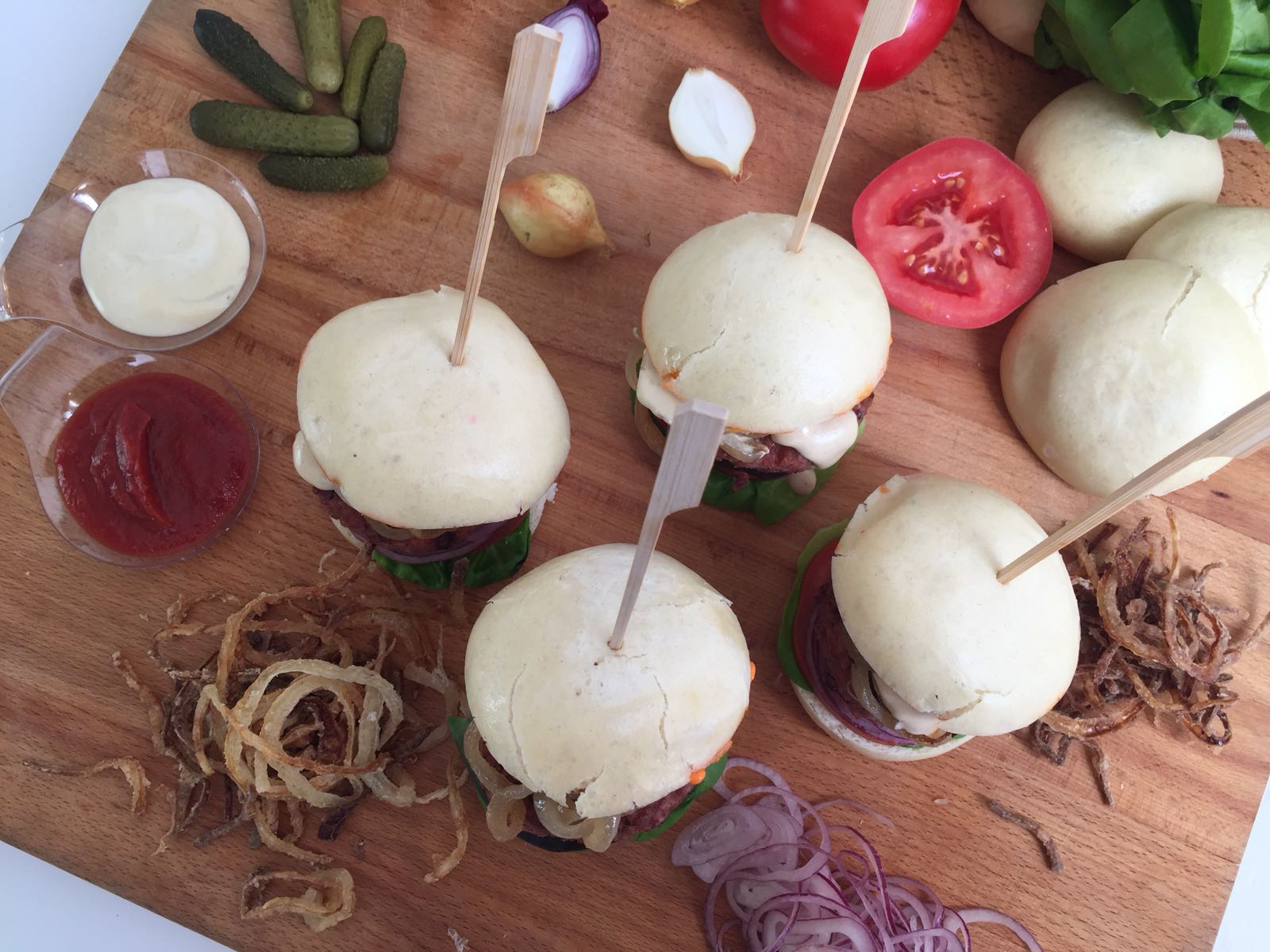 לחמניית באן מאודה במקום מוגשת עם מיני המבורגר מבשר טלה, לצד דפי עגבנייה, חסה, מלפפון חמוץ, בצל סגול, בצל מטוגן, קטשופ ומיונז ומוגש עם צ'יפס.
