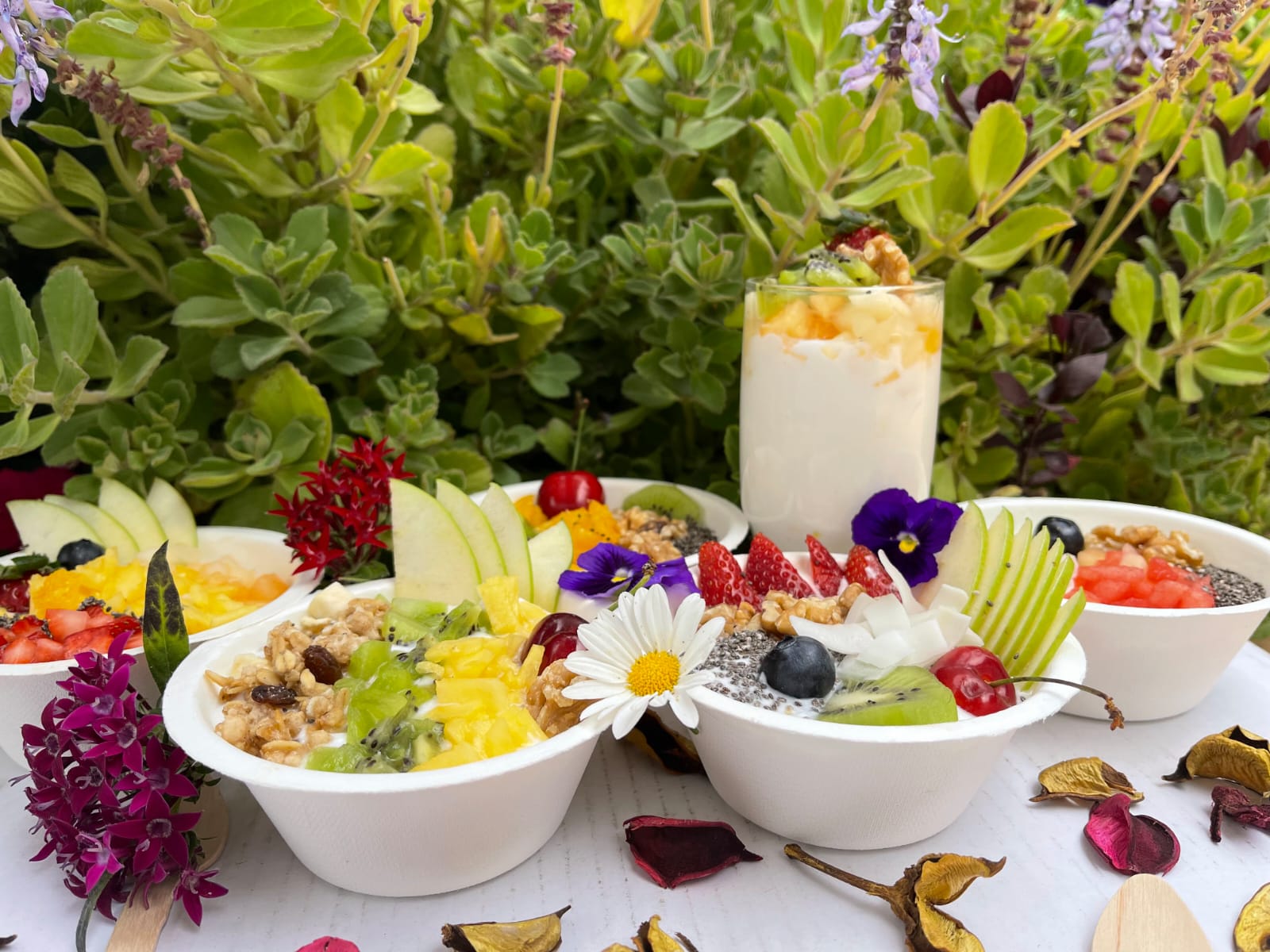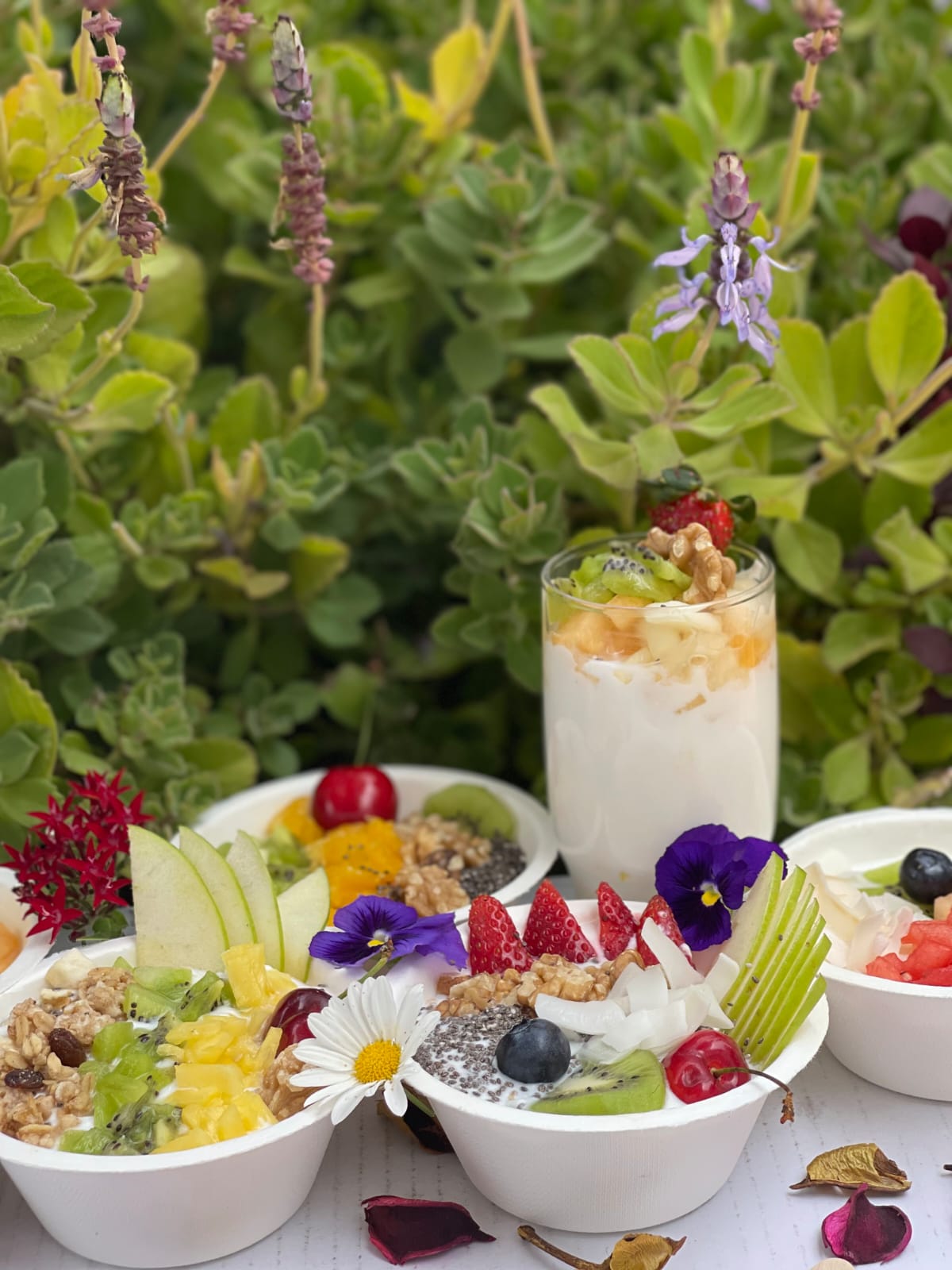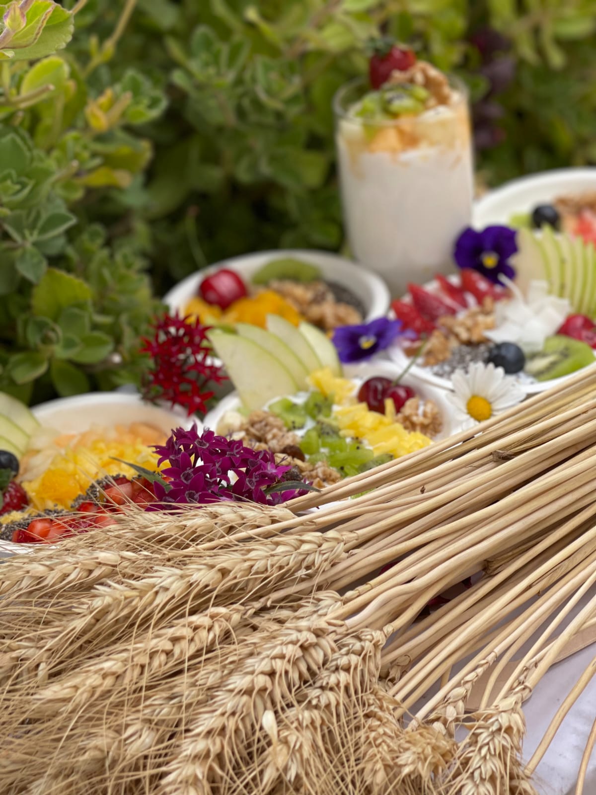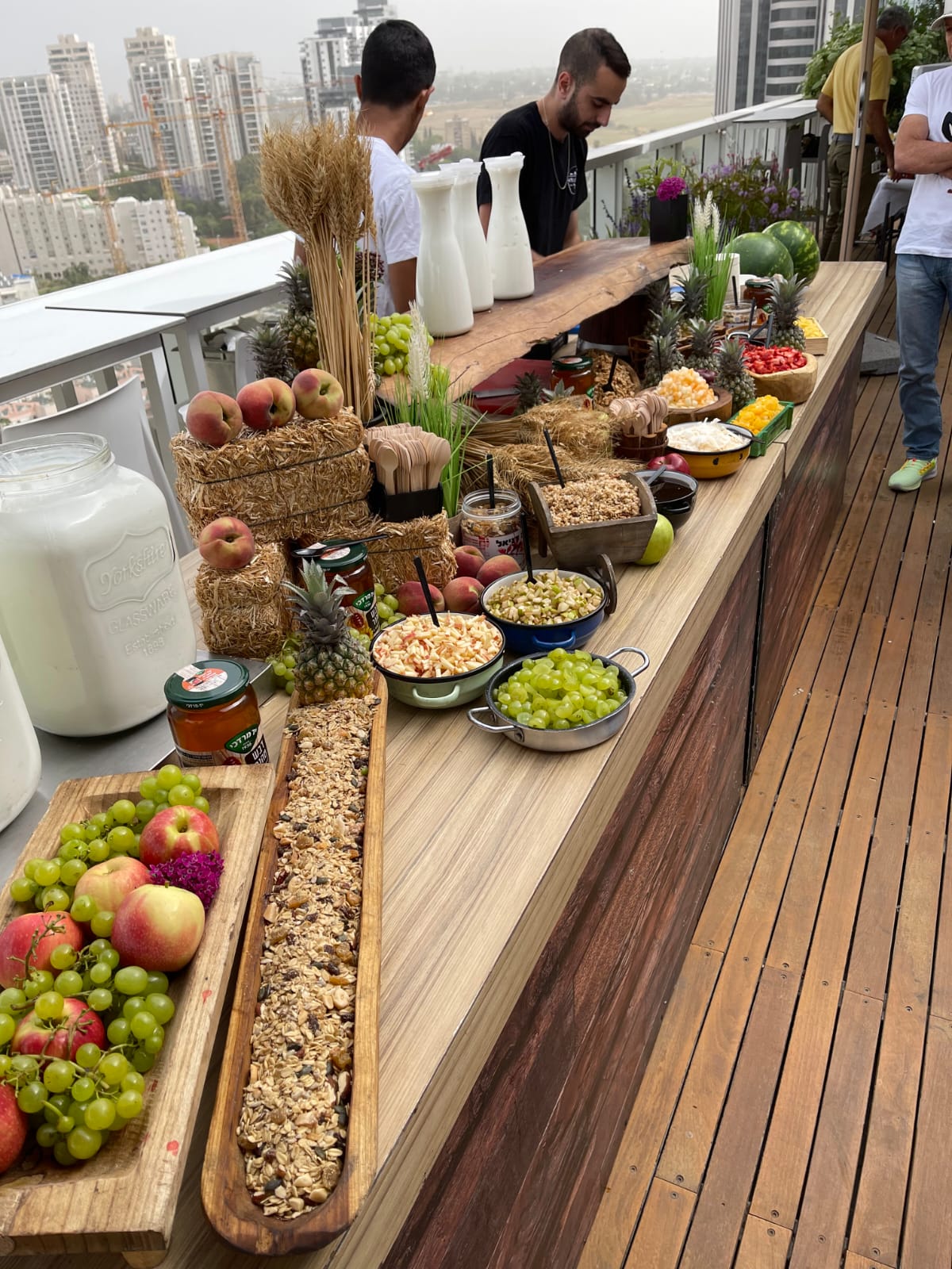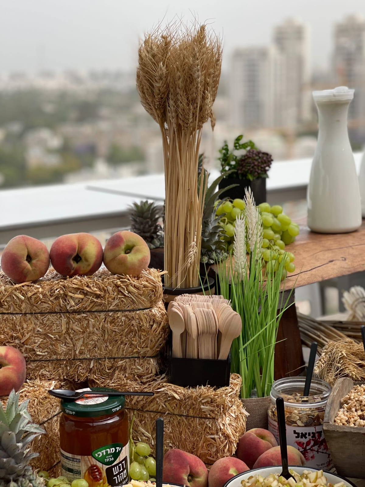 פירות בעונה כגון: תפוחים, תפוזים, קיוי, אבטיח, תמרים, תותים, מלון, אננס