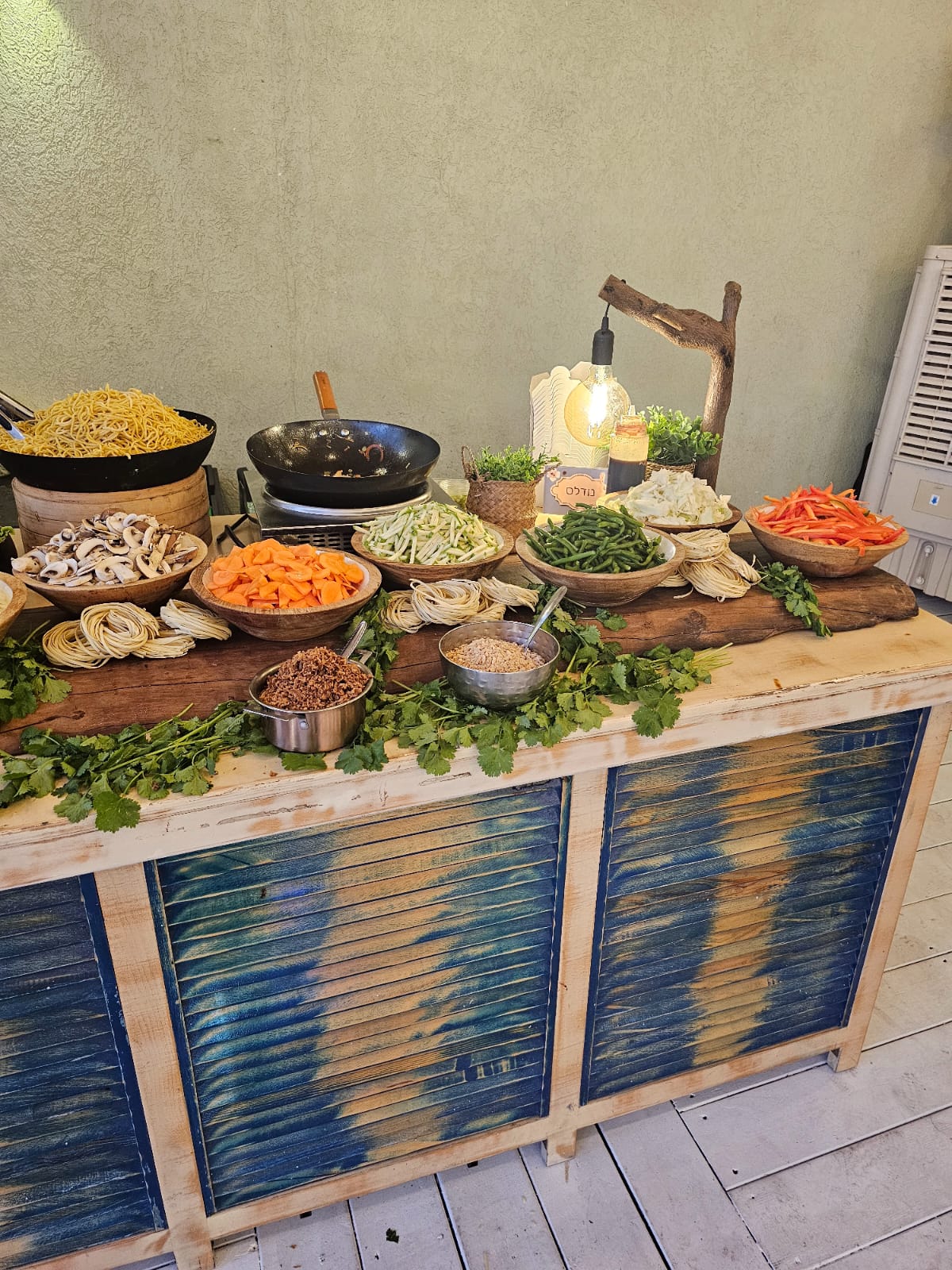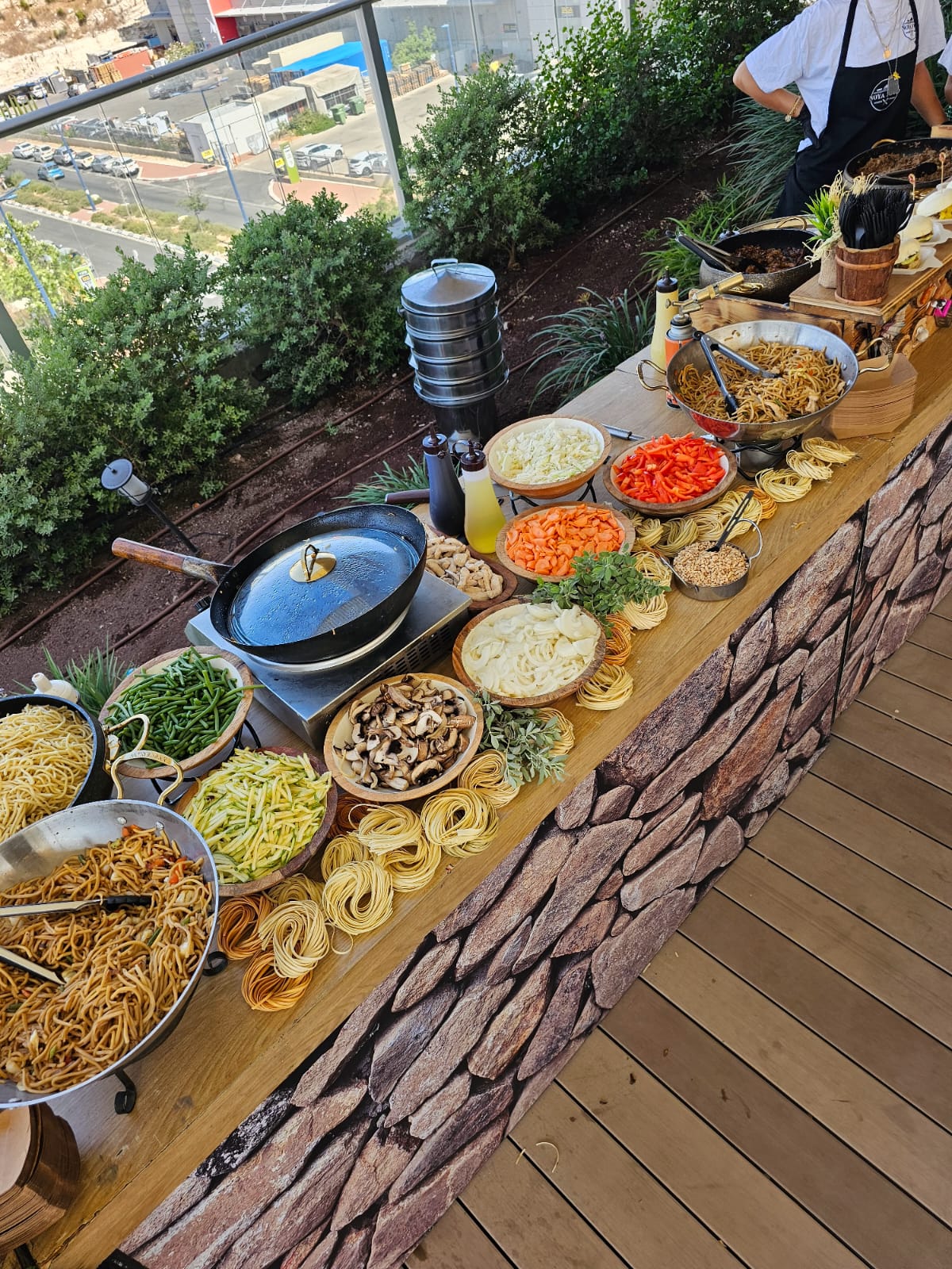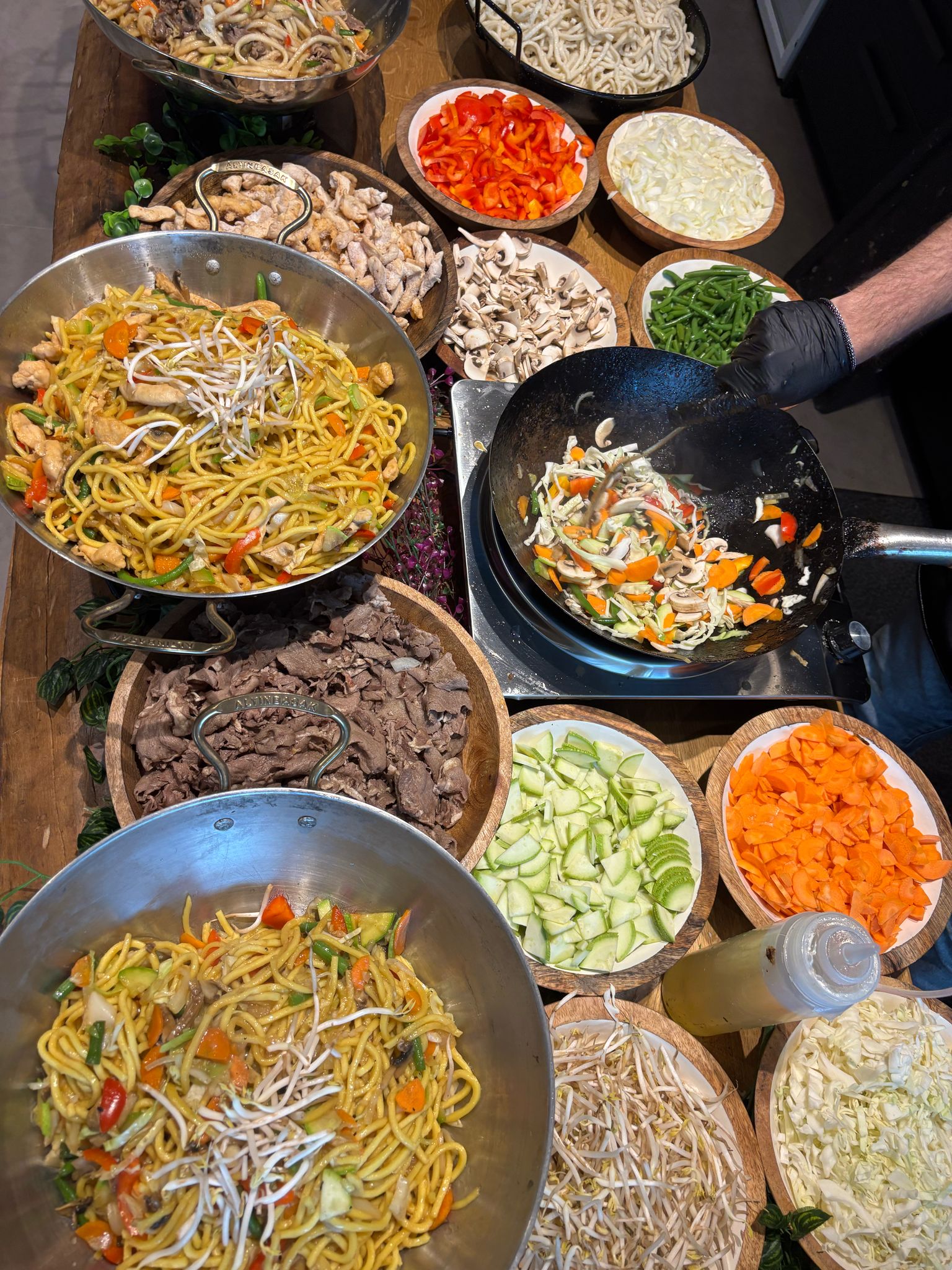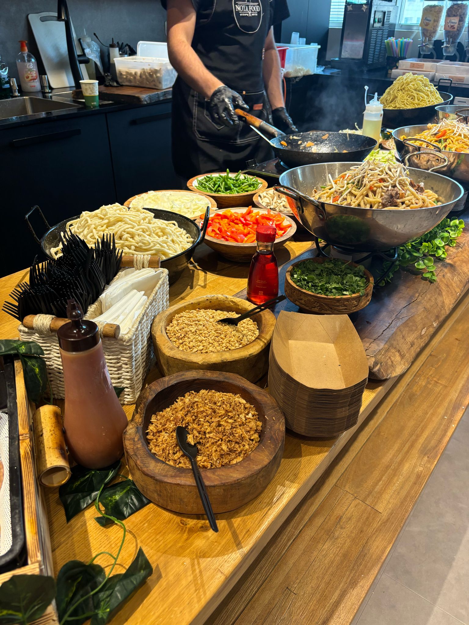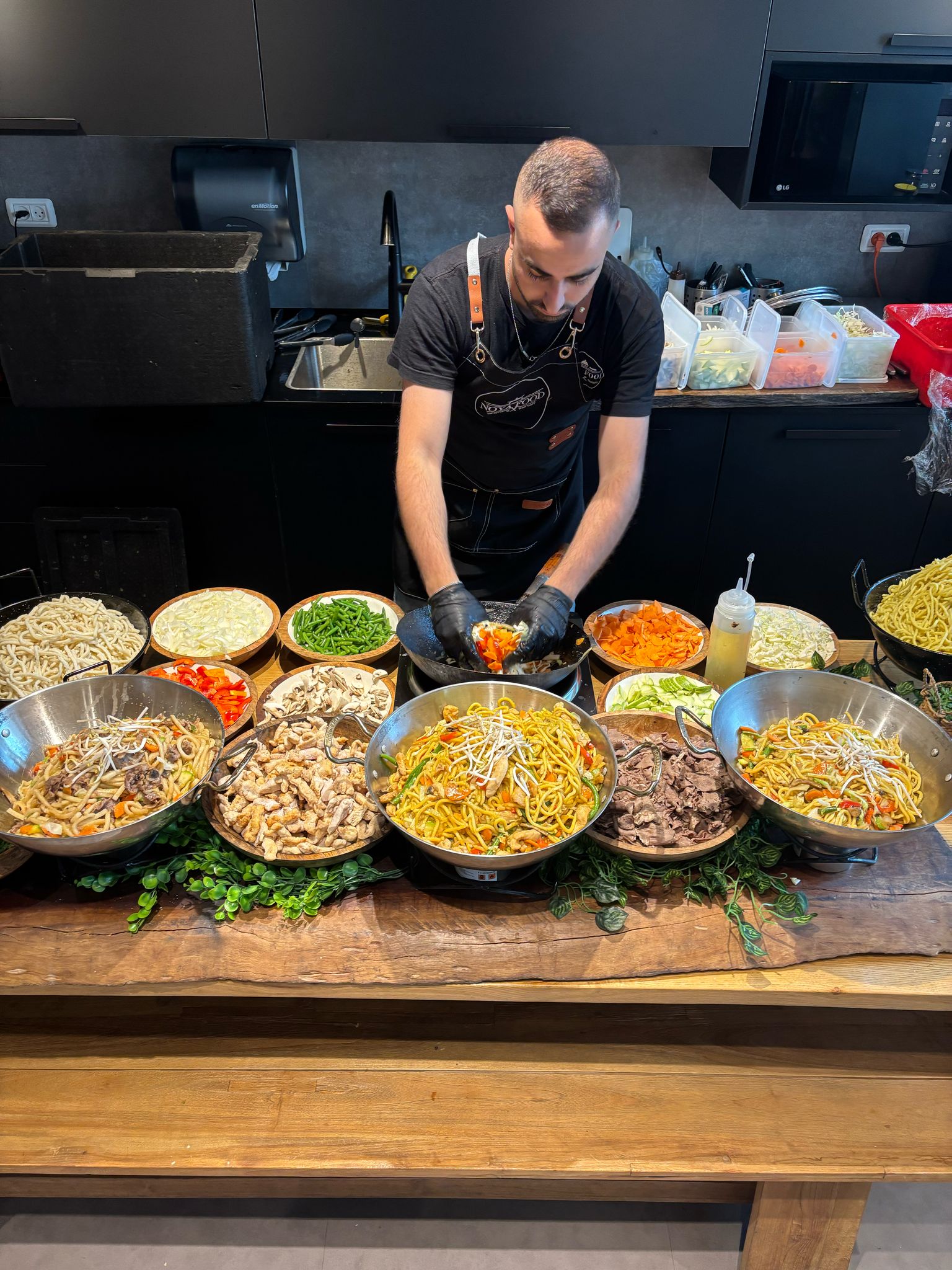 אנו מגיעים עם מחבת ווק על אינדוקציה חשמלית ומכינים את הנודלס בלייב לעיני האורחים