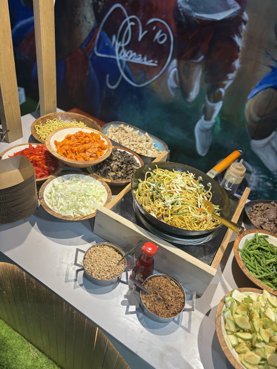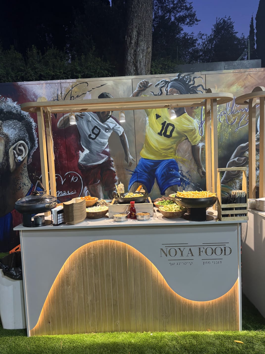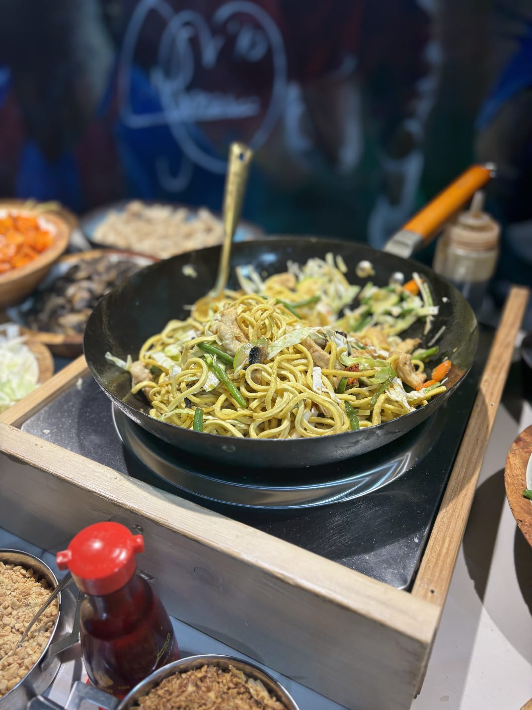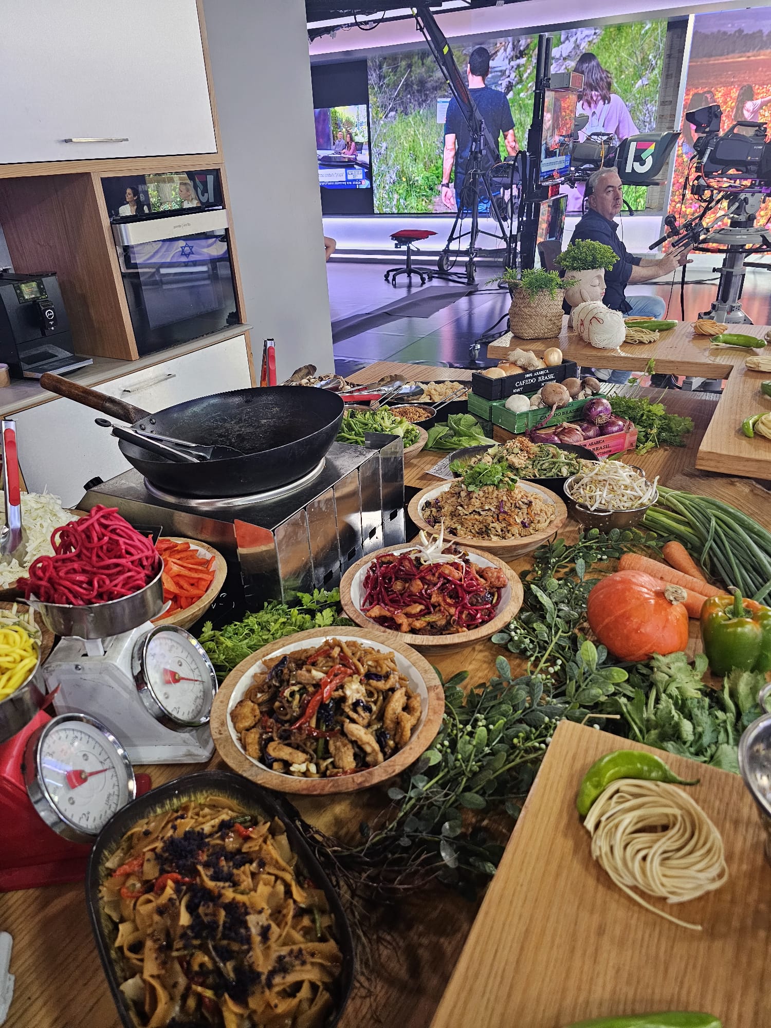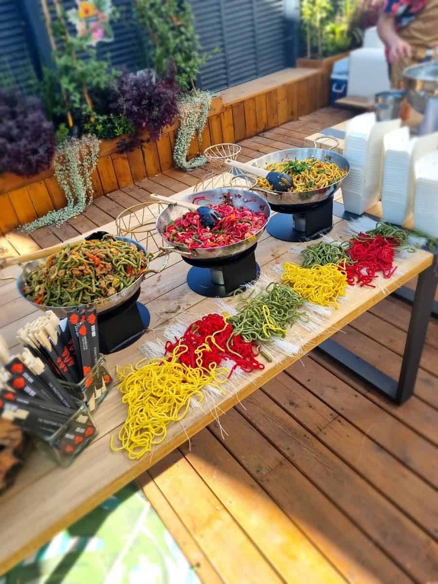 אנו מגיעים עם מחבת ווק על אינדוקציה חשמלית ומכינים את הנודלס בלייב לעיני האורחים