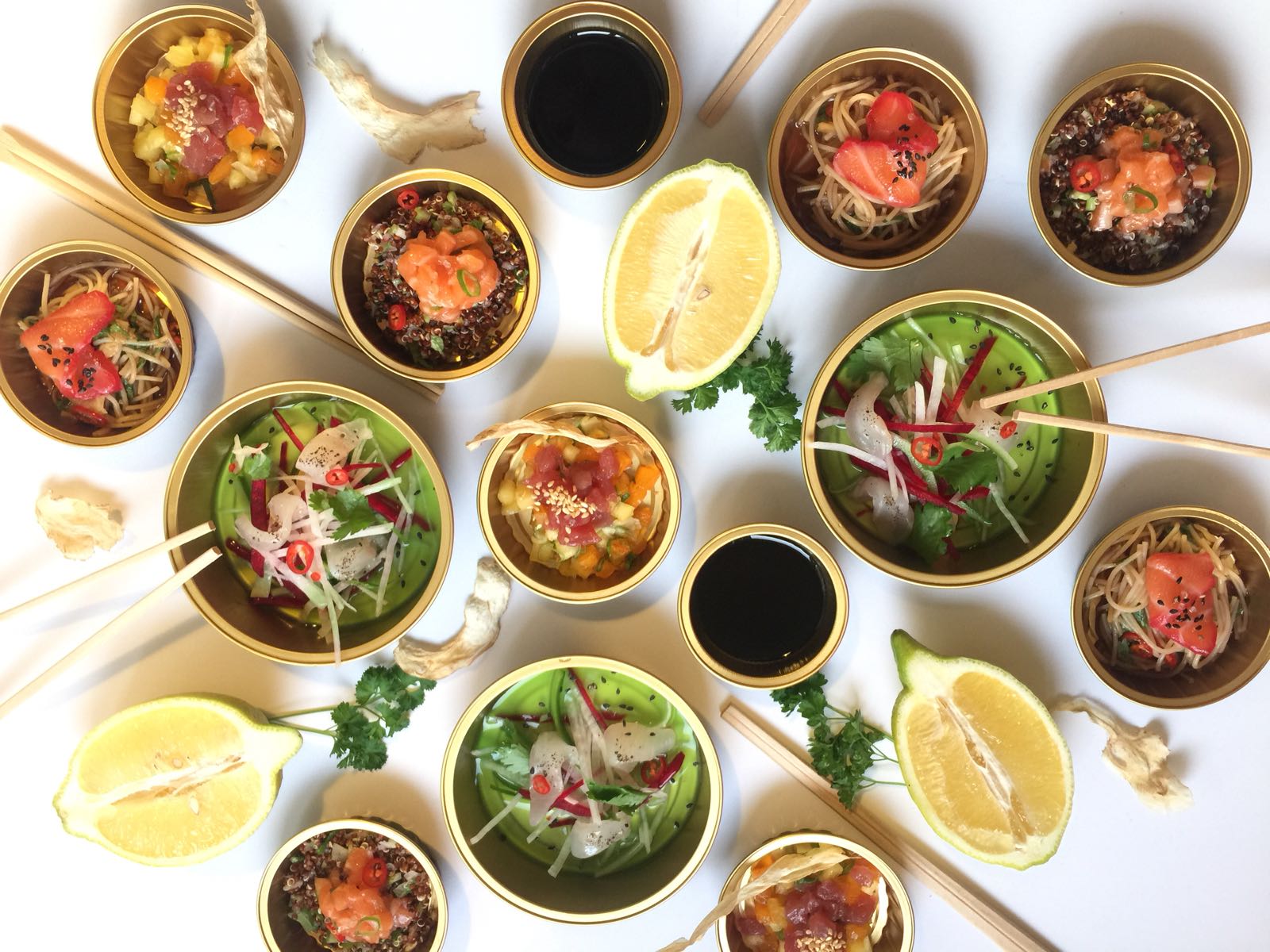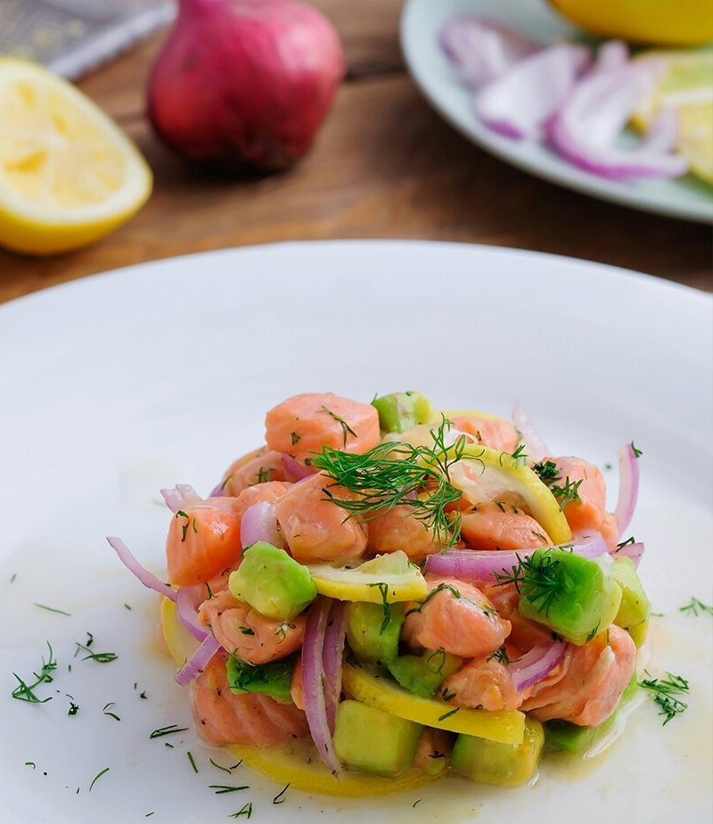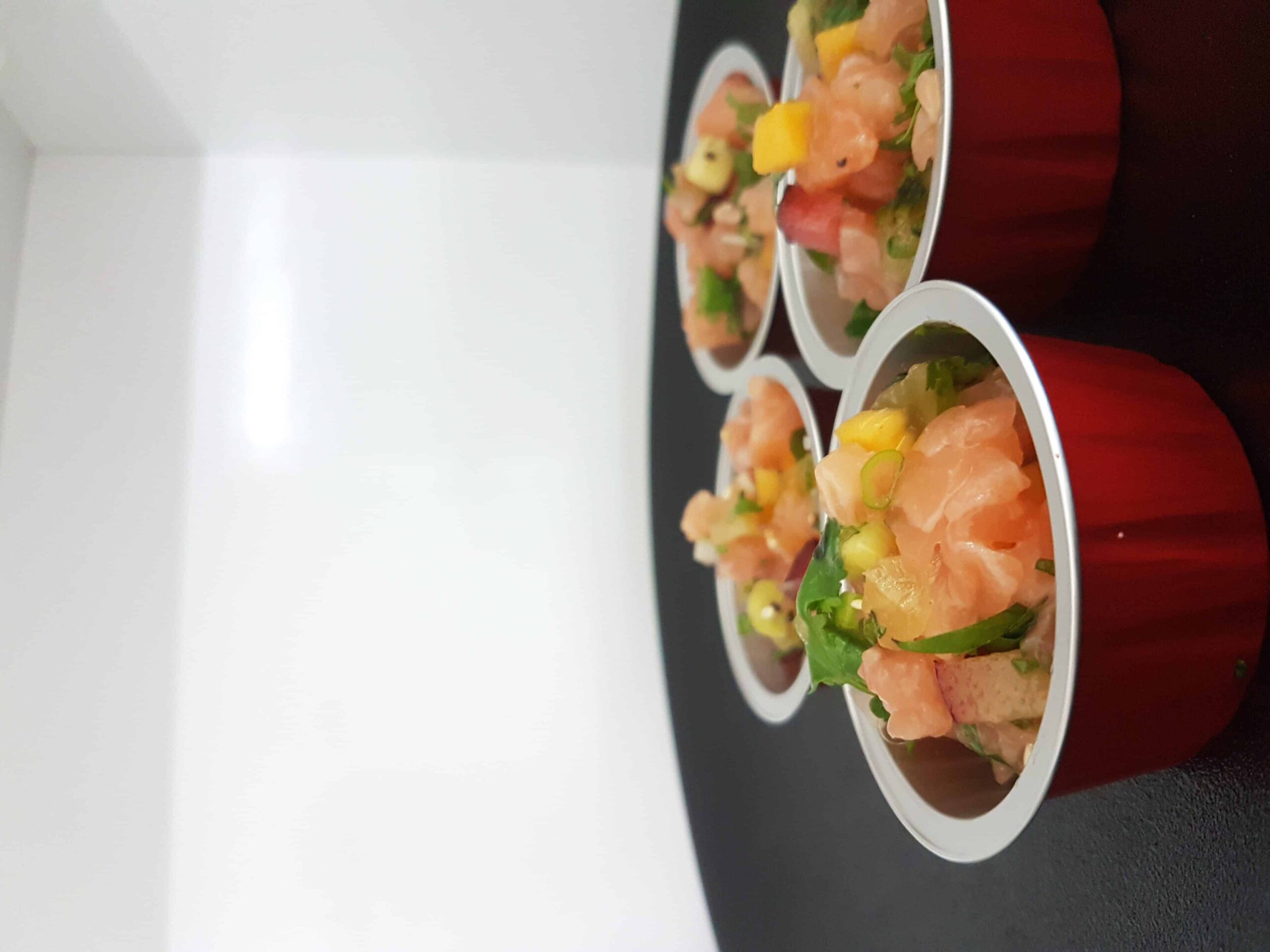- סביצ'ה סלמון.מוגש על סלט קינואה שחורה.אננס מסוכר.כוסברה.סלרי.ג'ינג'ר ויניגרט סוכר דקלים