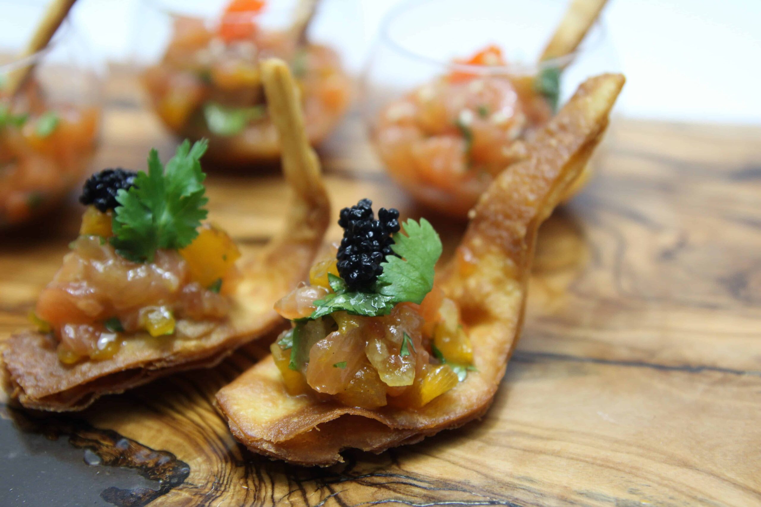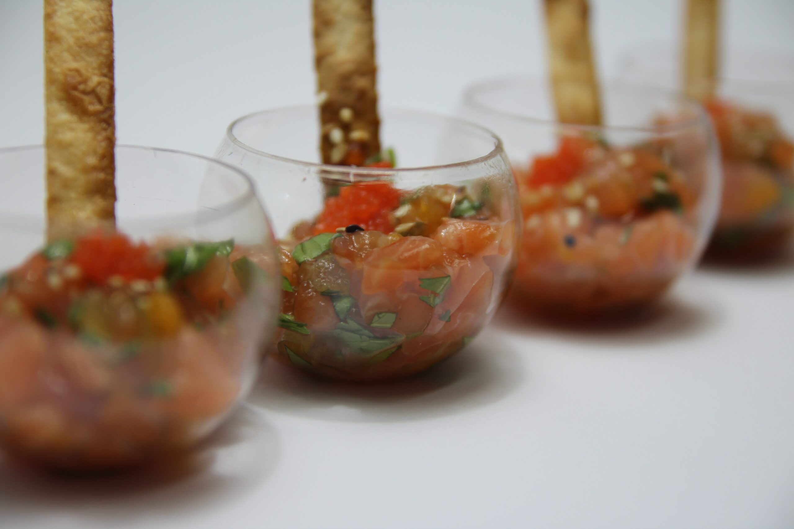 - סביצ'ה טונה אדומה .מוגש עם סלט פירות טרופיים.קרם ליקריץ'.כוסברה.צ'ילי.דפי ג'ינג'ר קריספי
