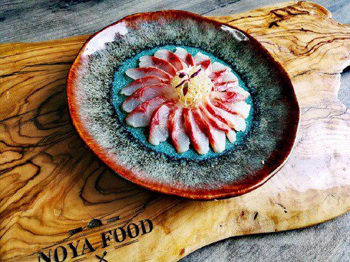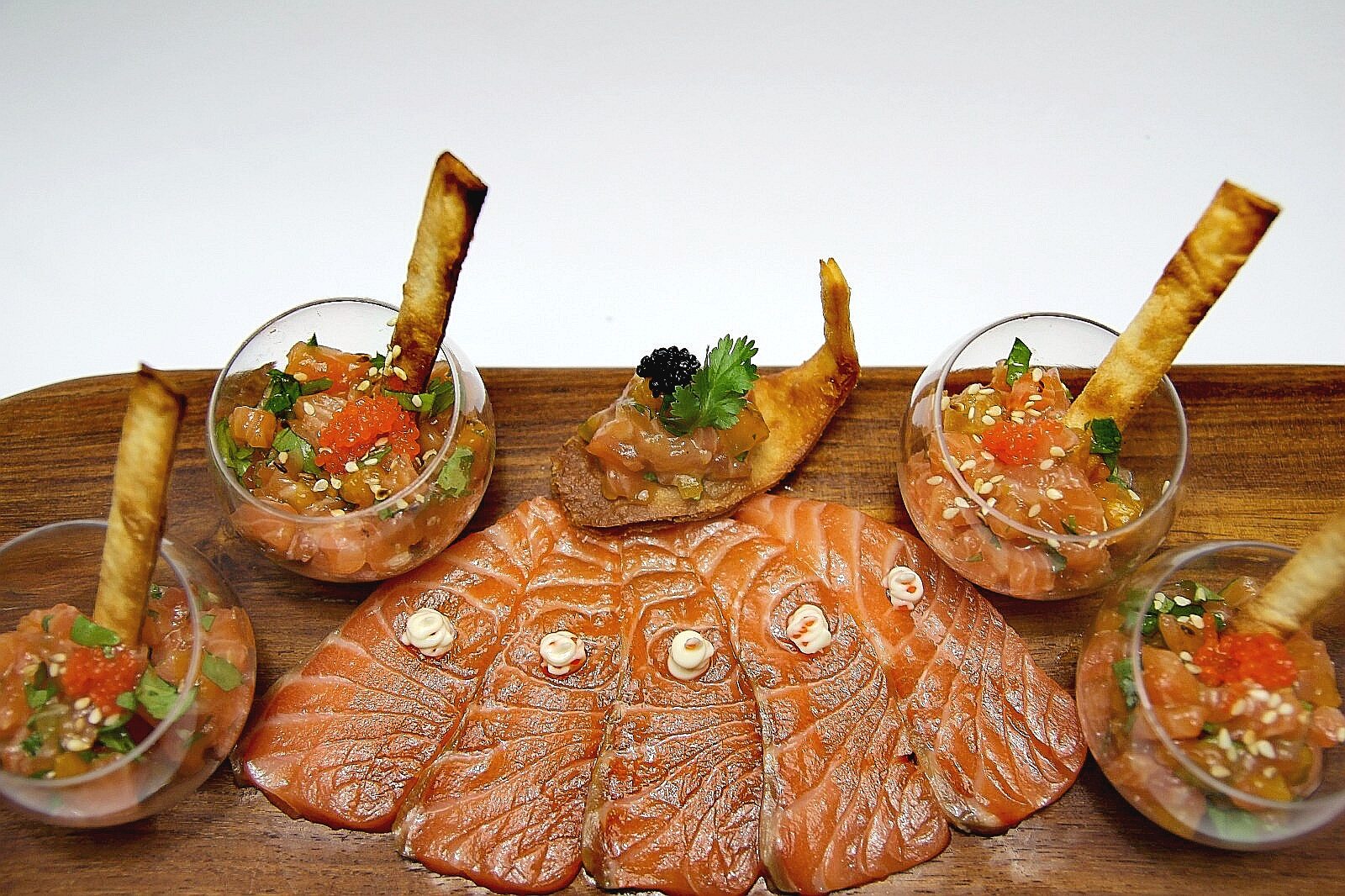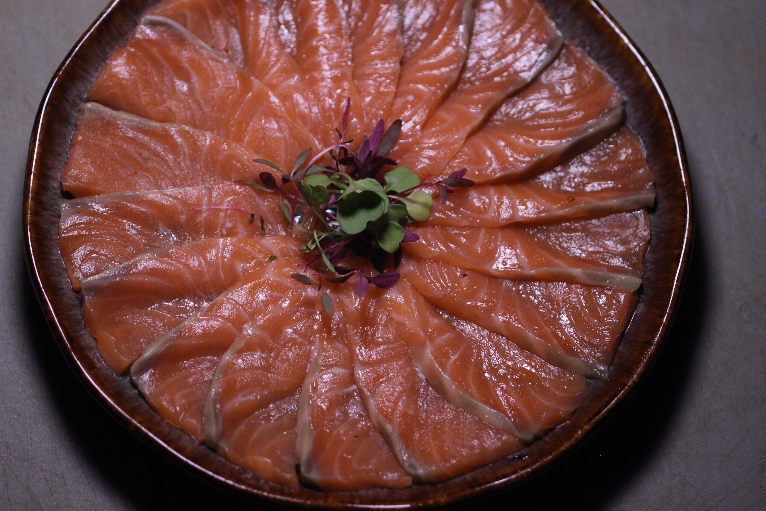 - סאשימי סלמון שחור על סלט איטריות דקות. עשבי תבלין. ויניגרט סויה מירין. ואיולי ספייסי