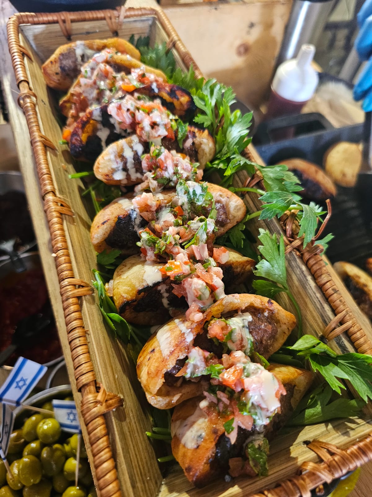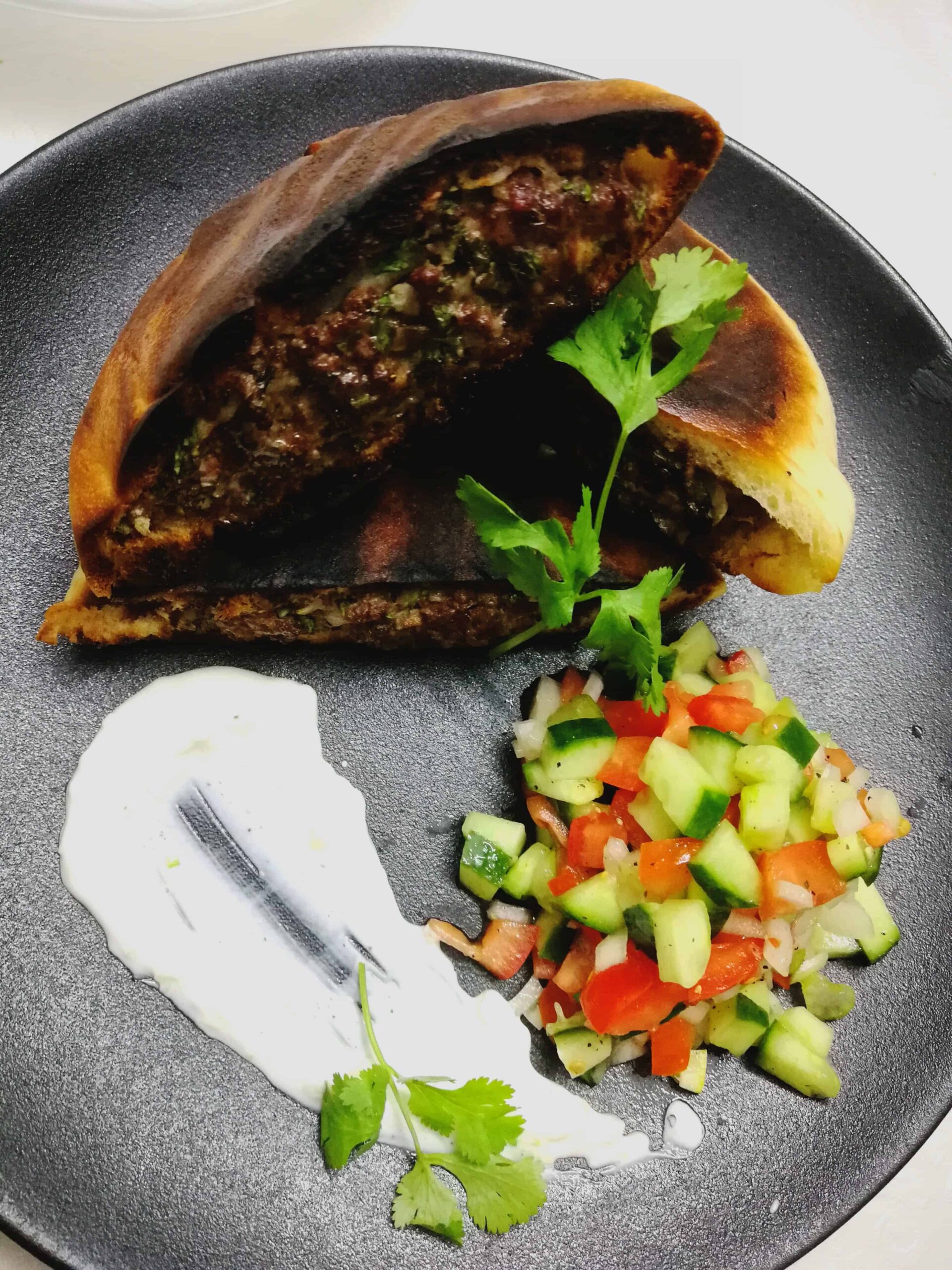 מיני פיתה עם בשר טלה ושומן כבש, אגוזים קצוצים, שום ופטרוזיליה, כל הטוב הזה חרוך על גריל פחם, מוגש עם טחינת הר ברכה, עמבה הודית, שיפקוניות, חמוצי הבית, עגבניות מרקש, סלט כרוב לבן ועשבי תיבול.