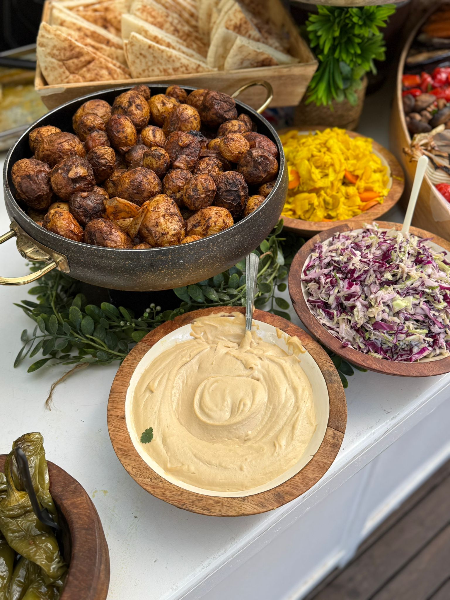 לחמי מחמצת,לחמניות,פיתות וממרחים:חומוס טחינה סלט כרוב במיונז מטבוחה,עמבה חריף,חמוצי הבית וזיתים