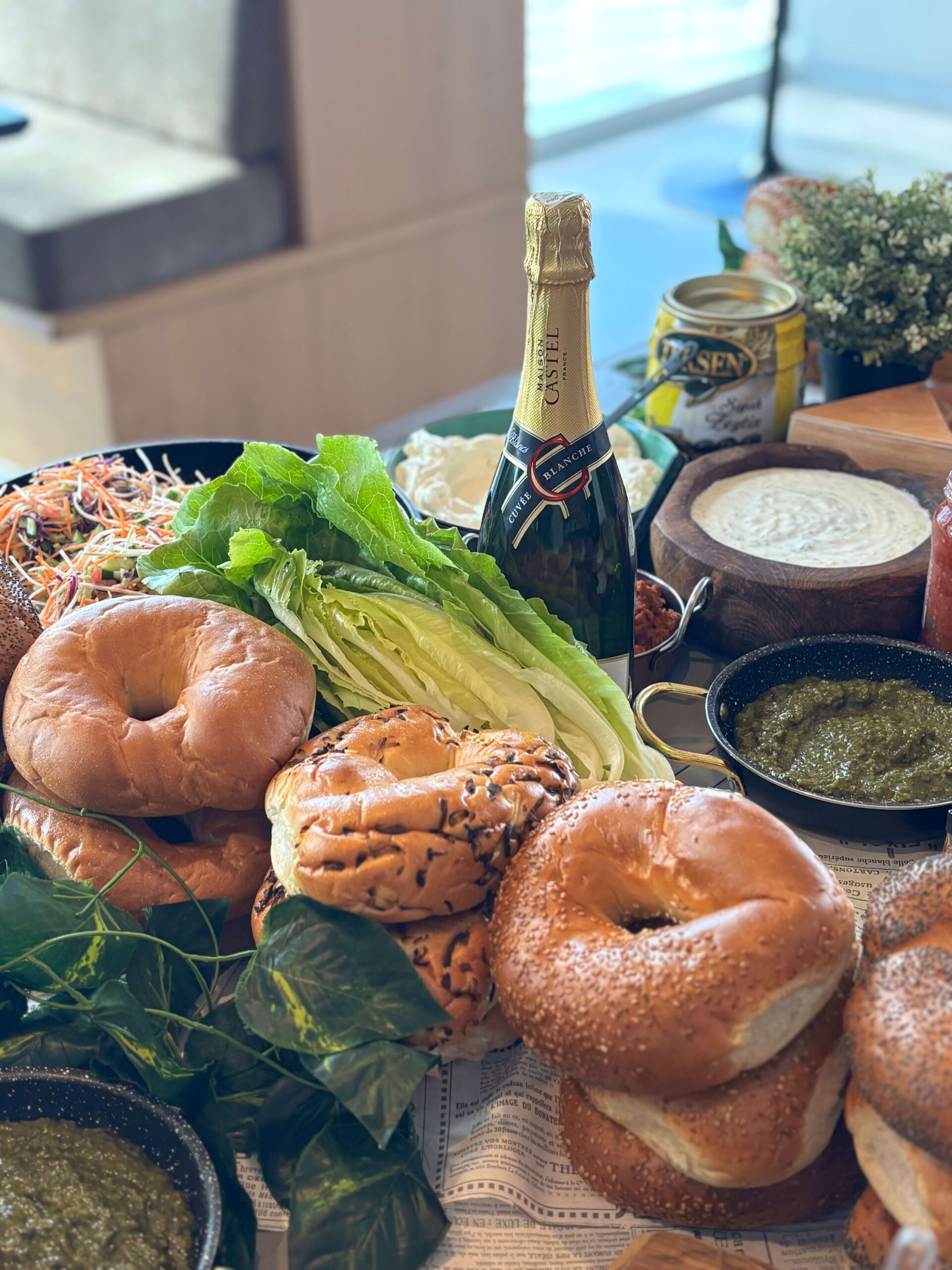 עמדה זו מגיעה עם מגוון בייגלים,סלט טונה,סלט ביצים,ירקות חתוכים,גבינת שמנת,קוויארים אנטיפסטי ממרח זיתים,ממרח פסטו,ועגבניות מיובשות