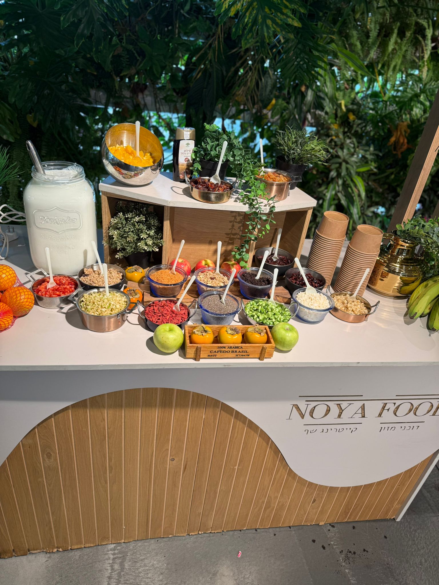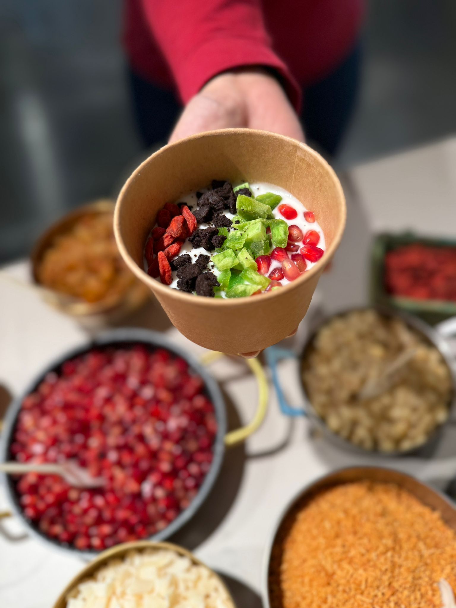 ג'וג'י ברי, זרעי צ'יה, אגוזי מלך, פקאן מסוכר, קוקוס מסוכר, סילאן, דבש וכמובן יוגורט עיזים מובחר.