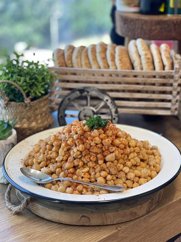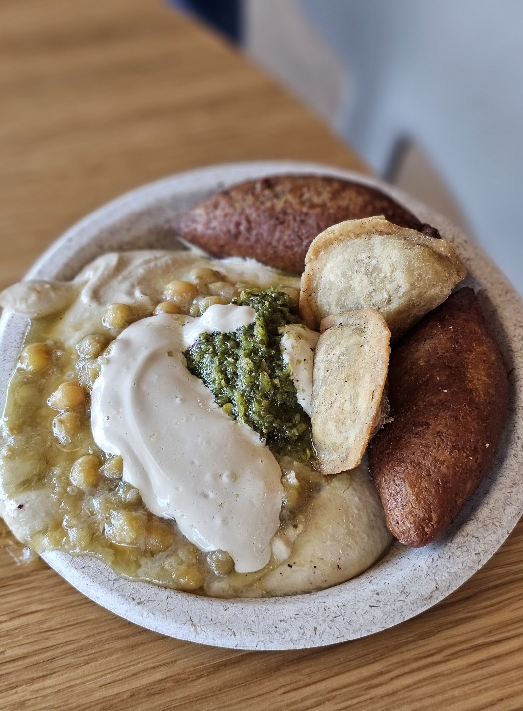 עמדת חומוס בהרכבה אישית, חומוס איכותי עבודת יד, תוספות על החומוס: גרגירי חומוס, פול, רוטב חומוס חריף, בצל סגול, פטרוזיליה קצוצה, ביצה, טחינה, שמן זית, זעתר פפריקה בשמן, מוגש עם פיתה חמה.