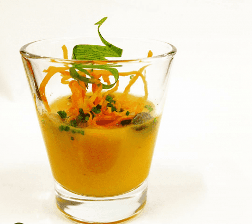 מוגש עם צ'יפס בטטה וג'וליאן בצל ירוק.
