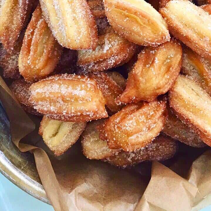 מעבירים מיד למגש עם סוכר וקינמון, מגלגלים עד שהצ'ורוס מכוסים ומגישים חם.