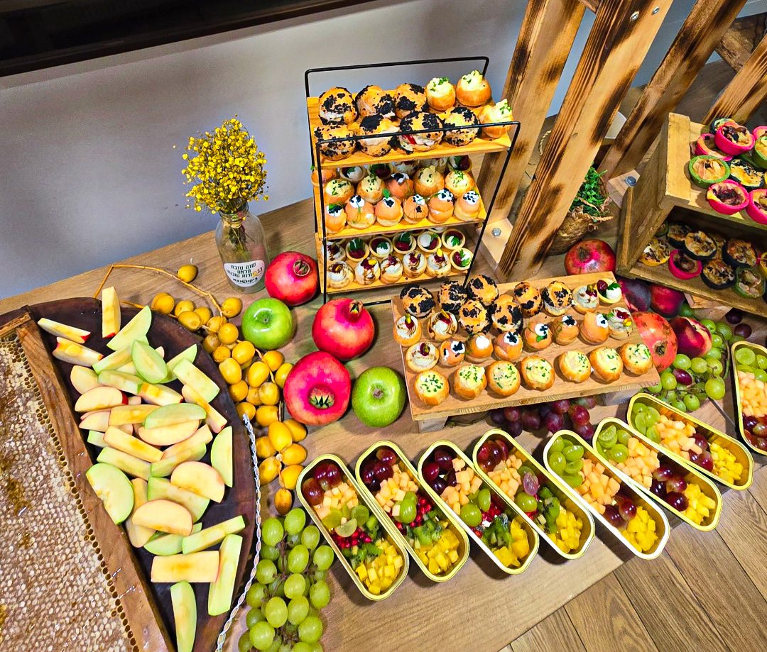 קונספט ראש השנה,דוכן בופה עשיר עם מגוון פירות העונה,חלות דבש, ,מאפים שתייה קלה,יין ועוד…